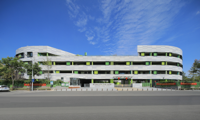 河西新城四小位于南京市建邺区江山大街以北、黄山路以东,建筑面积2.79万平方米,教学楼主体4层,局部3层,地下1层,建筑高度16.95米,可容纳教职工和学生1705人。建筑整体采用扁平化“曰”字形结构,包含传道授业的教学理念,造型可演化为铅笔、书籍、绿叶,寓意在学习中获得知识、不断成长。