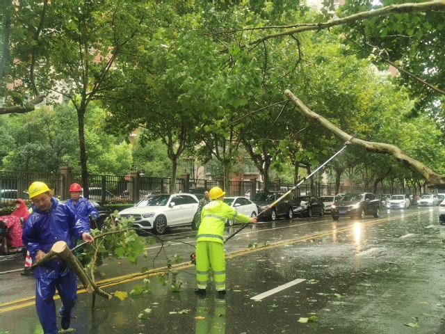 面对突发险情,必赢3003no1线路检测中心园林公司迅速启动应急响应,立刻安排绿化养护消险队伍及车辆赶赴现场开展清理工作。由于有防汛防台应急预案和防汛应急演练的消险实战经验,消险队伍一到现场就快速做好安全警示工作,提醒过往车辆小心避让,紧接着佩戴好安全防护用品开始作业。根据实地情况和大树清理的安全操作规程,消险队员们首先对法桐按照侧枝、主干、空腐树根的顺序进行切割处理,然后分段锯开树干,最后打包拖运,完成现场清扫工作。