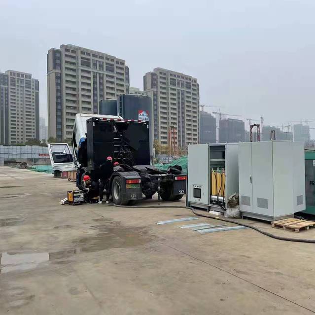 受接入的施工用电线路功率限制,现有配电箱无法满足新增打桩设备用电需求。按常规做法需增设柴油发电机,但此类型发电机噪音大,排放高温废气,不符合现代社会节能环保的大趋势。因此,本项目率先引进无噪音、无废气排放的锂电移动储能动力站与施工用电线路并网,在施工用电低谷期间进行电池充电,桩基施工用电高峰期间补充电力缺口。如接入的施工用电线路长期满载,可由储能动力站厂家运送满电电池进行现场换电,将缺电电池运回充电。
