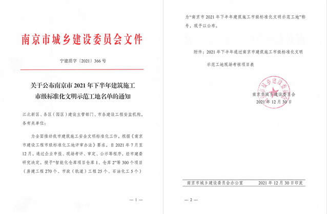 近日,必赢3003no1线路检测中心新城公司河西金融中心项目喜获市建委工程质量安全监管处发布的2021年下半年“市标准化文明示范工地”称号。