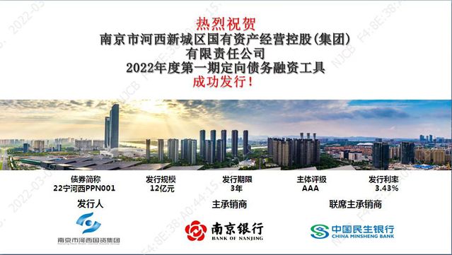 本次债项发行在主承销商南京银行,联席承销商中国民生银行的共同努力下成功首发12亿元(债券简称:22宁河西PPN001)。