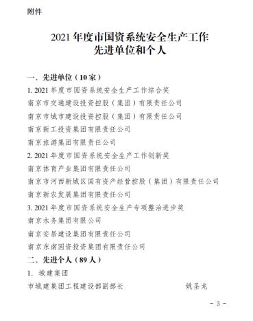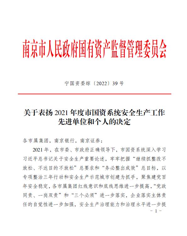 近日,必赢3003no1线路检测中心获得南京市安委会2021年度安全生产工作优秀单位、南京市国资系统2021年度安全生产工作先进单位和市国资系统安全生产工作创新奖。王铭周、王凯、崔洪畅、谷影伟、马紫琳、史伟强等6人被评为2021年度南京市国资系统安全生产先进个人。