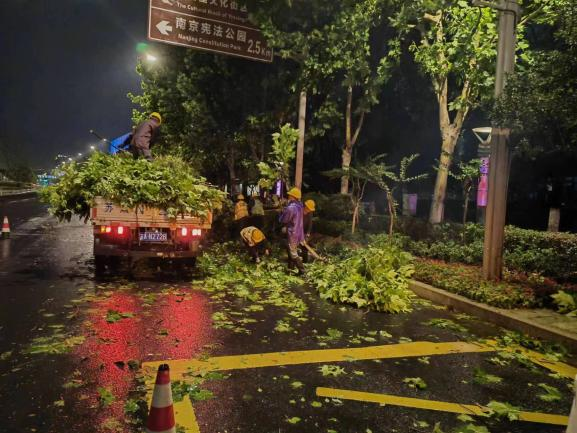 集团滨江公园公司负责河西滨江风光带八大公园约17公里江河岸线的日常管养工作。为做好公园绿化安全生产保障工作,滨江公园公司全员出动,全力做好滨江公园园区硬质设施检查维护、倒伏树木和大型断枝消险、园路及绿化内落叶断枝清理和积水点位助排等工作。在现场采用警戒绳、围挡等避免行人游客接近,并对园内存在安全隐患的宣传横幅和广告牌等进行回收和拆解。截至11日晚,滨江公园公司完成斜树扶正18株、断树倒树清理8株,基本完成园区道路两侧及周边落叶断枝等杂物清理。