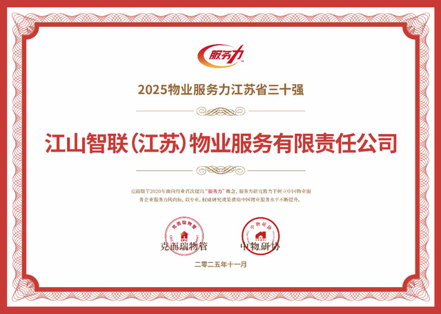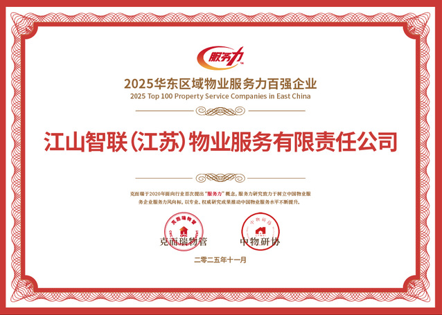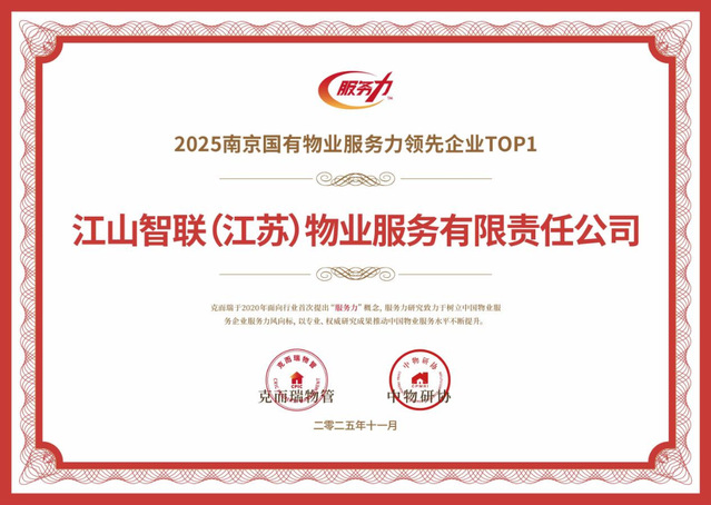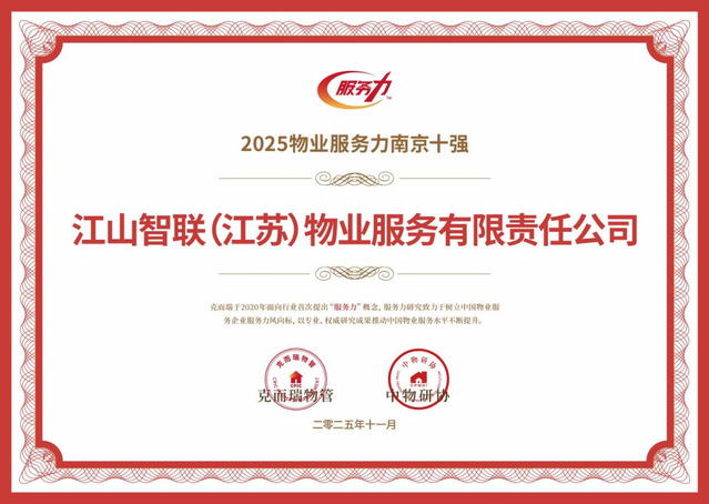 必赢3003no1线路检测中心江山智联物业凭借卓越的服务品质与前瞻的战略布局,一举斩获2025南京国有物业服务力领先企业TOP1、2025江苏省服务力市场运营领先企业TOP3、2025物业服务力南京十强、2025物业服务力江苏省三十强、2025华东区域物业服务力百强企业、五项行业重磅荣誉。