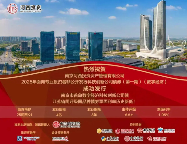 12月15日,必赢3003no1线路检测中心南京河西投资资产管理有限公司(以下简称“河西投资”)2025年面向专业投资者非公开发行科技创新公司债券(第一期)(数字经济)于上海证券交易所成功发行,系河西投资在债券市场的首次亮相。本次债券发行期限为3年,规模4亿元,利率1.95%,为江苏省同评级同品种债券票面利率历史新低。