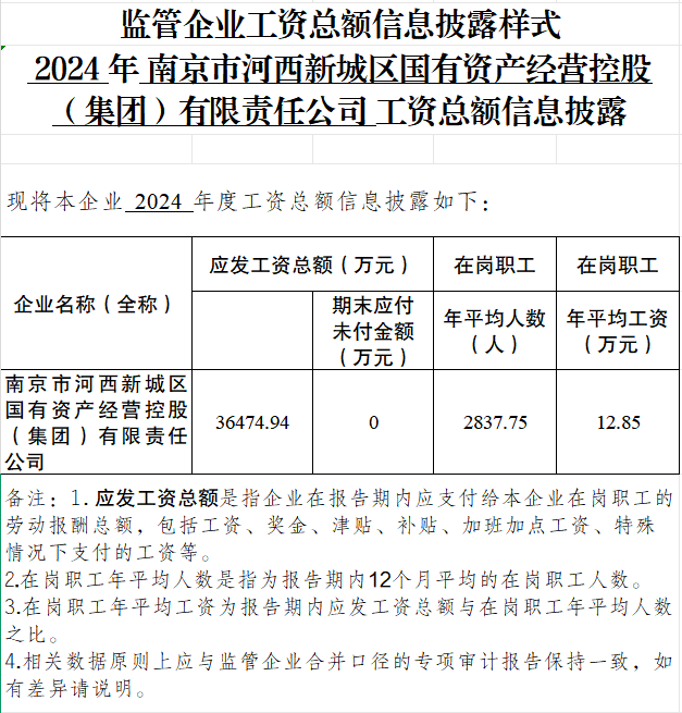 2024年南京市河西新城区国有资产经营控股(集团)有限责任公司工资总额信息披露